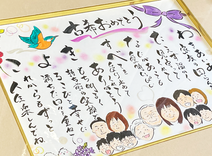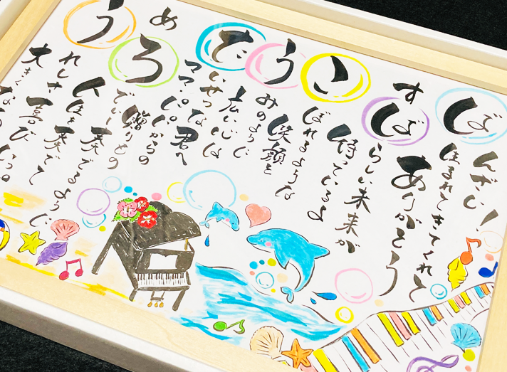 筆文字ギフトの定番。お贈りする方のお名前からポエムをつくり、色紙やはがきに書き入れて額にお入れします。